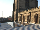 We developed a bespoke lead roll clamp for use on the twelfth century, grade 2* listed St Mary's Church in Hinckley (photo bottom right). The existing alternatives were a heavy ballasted system or fixings into the roof. Our solution is lightweight and non-invasive, and we hope will open up the possibilities for many other lead rolled roofs.
