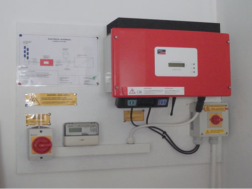 The inverter is the "brains" of the system; this changes the D.C. current from the modules to the correct frequency of A.C. current, and transforms the voltage to 240v. The inverter monitors both the D.C. and A.C. side and protects the system by shutting it down if a fault occurs. As soon as it registers that everything is normal, it will restart by itself.