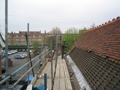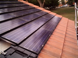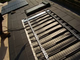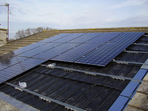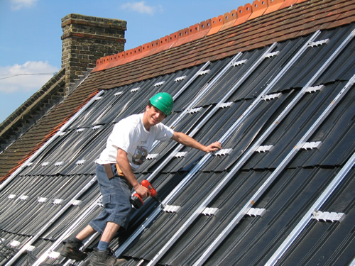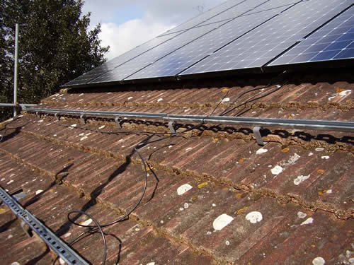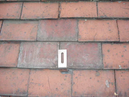 On tiled roofs, roof-hooks are fitted under the tiles to hold the rails, which in turn will hold the modules. The hooks are fixed to the rafters with 3inch coach-screws and with the nibs cut off, the tiles sit as flat on the roof as they did before. Flat clay tiles will need to be cut and dressed with lead in order to fit round the hooks.